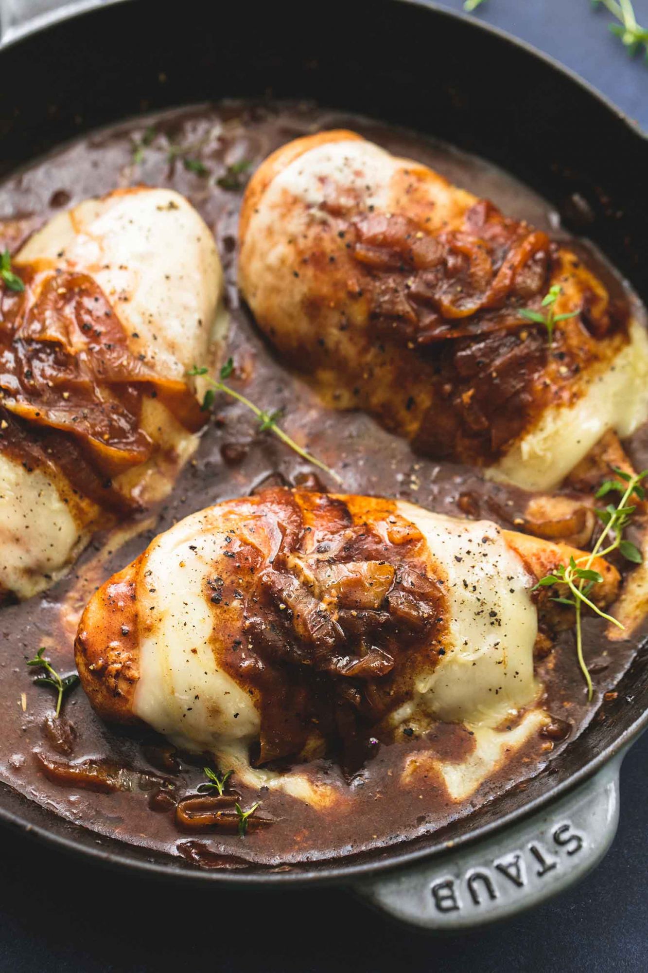 Spoon some of the onions and gravy over the top of the chicken, garnish with thyme or parsley and cracked black pepper, and serve.