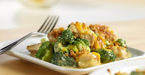 2.Stir the soup and milk in a small bowl. Pour the soup mixture over the broccoli and chicken. Sprinkle with the cheese. Stir the bread crumbs and butter in a small bowl. Sprinkle the bread crumb mixture over the cheese.