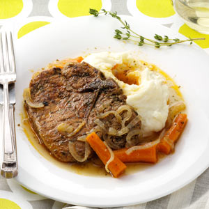 Return chops to pan. Cover and bake at 325° for 1-1/2 to 2 hours or until meat and vegetables are tender. Thicken pan juices for gravy if desired. Serve with potatoes.