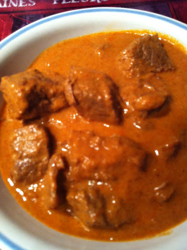 Add paprika, salt, hot water and tomatoe sauce- combined with a wooden spoon, add beef and stir with a wooden spoon,cover and turn down to simmer for 3 hours or til tender