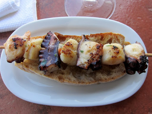 Una vez hecho esto, introducimos el pulpo y los callos en la brocheta alternando un trozo de cada uno.