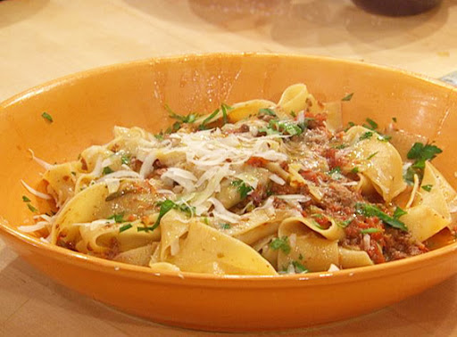 Heat a large Dutch oven over medium-high heat with EVOO, 2 turns of the pan. Add pancetta brown to crisp, remove and drain. Melt butter in pan, pat meat dry and add it to the pan. Brown well, season liberally with coarse black pepper and a little salt. Add herb bundle and bay, carrot, celery, onions and garlic. Stir to soften a few minutes; add tomato paste and stir until fragrant. Add wine to deglaze and reduce by half. Add tomatoes and consommé. Break up the tomatoes a bit then reduce heat to a simmer. Cook about 30 minutes to break down tomatoes. Stir in milk and simmer 20-30 minutes more over low heat while you cook the pasta.