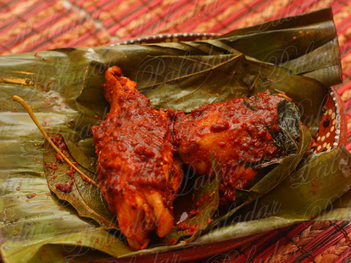 Asegúrese de que el pollo esté cubierto por todos lados con una capa gruesa y pareja de la pasta de chile. Si utilizas las hojas de aguacate quémalas ligeramente, sobre la llama o comal y colóquelas por debajo y por encima del pollo y agrega una hoja de laurel. Envuélvalo con hojas de plátano, en forma de tamal individual y colóquelo en la parte superior de la vaporera.