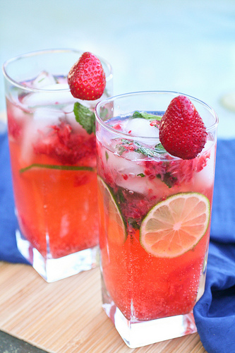 Place strawberries, mint, and some ice (crushed ice works best) in a tall glass. Muddle the ingredients together with the back of a spoon (or a muddler if you have one.) Add simple syrup, rum, and lime juice. Pour in enough club soda to fill the glass. Give the mixture a stir, and garnish with fresh strawberries and lime slices.