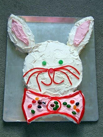 LEAVE 1 cake whole. Use serrated knife to cut remaining cake into 3 pieces as shown in diagram. (See Tip.) Arrange on large foil-covered board or platter to resemble a bunny's head and bow tie, using small amount of COOL WHIP to attach pieces to each other.