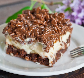 Pour cream cheese mixture over the semi baked brownie and smooth the top with a rubber spatula.