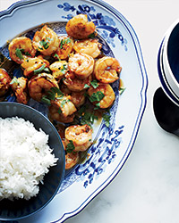In a large skillet, heat 2 tablespoons of the oil. Season the shrimp with salt and pepper. Cook half of the shrimp over moderate heat, turning once, until white throughout, 3 to 4 minutes. Transfer the shrimp to a plate. Repeat with the remaining olive oil and shrimp. Return all of the shrimp to the skillet, add the orange glaze, season with salt and pepper and toss to coat. Transfer the shrimp to a platter, garnish with parsley and serve with rice.