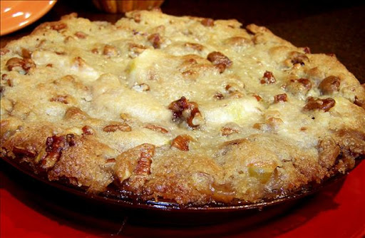 Fill pie dish with apples, sprinkle on 1/4 cup sugar and the cinnamon. Combine melted margarine, the remaining sugar, 1 cup flour, 1 egg and chopped walnuts. Pour over apples. Bake at 350° for 45 minutes or until golden. Top with whipped cream or ice cream and serve.