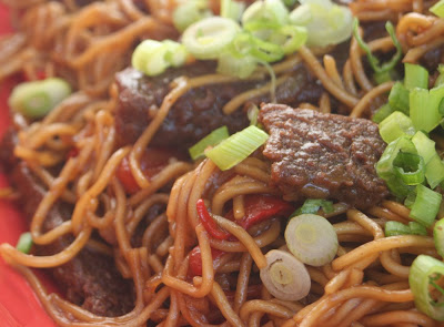 2. Add noodles, mix well, and heat through. If the dish is too dry, add more bean sauce and water. Adjust to taste. Top with sliced onions and serve.