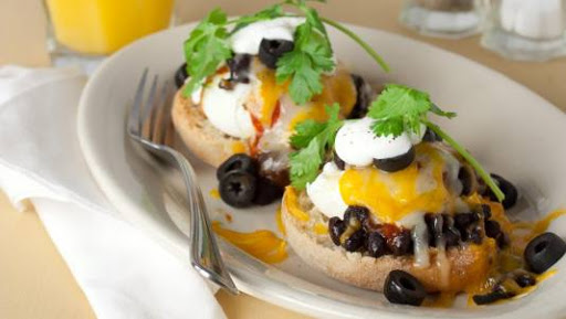5. Spoon black bean mixture over eggs. Spoon picante sauce over black beans. Sprinkle top with shredded cheeses and place under broiler until melted.
