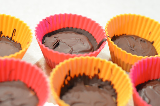 2. Spoon about a teaspoon sized portion of the chocolate into the middle of a silicone muffin cup. Coat the chocolate up the edges of the muffin cup with the back of the spoon so that the inside is covered in chocolate half way up. Repeat with the remaining muffin cups and then put them in the refrigerator for about an hour or until the chocolate hardens.