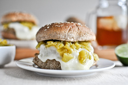 While the burgers are cooking, toast buns if desired and combine remaining green chilis in a bowl with honey, lime juice, and a sprinkle of salt and pepper (green chili sauce here adapted from bobby flay). When ready to serve, spoon green chilis on top of cheeseburgers and eat!