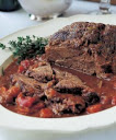 Remove the roast to a cutting board. Remove the herb bundle and discard. Skim off as much fat as possible from the sauce. Transfer half the sauce and vegetables to a blender or a food processor fitted with the steel blade and puree until smooth. Pour the puree back into the pot, place on the stovetop over low heat, and return the sauce to a simmer. Place 2 tablespoons flour and the butter in a small bowl and mash them together with a fork. Stir into the sauce and simmer for 2 minutes, stirring until thickened. Taste for seasonings. Remove the strings from the roast, and slice the meat. Serve warm with the sauce spooned over it.