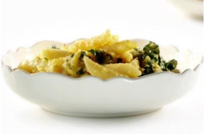 Cook the pasta to al dente and save a small ladleful of starchy cooking water just before draining. Toss the pasta with the puree, greens and starchy water; transfer to baking dish and top with more cheese. Cool and store.