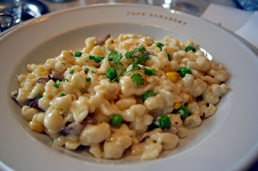 Add 2 tablespoons of butter and the oil to a large skillet over medium heat. Add the cooked spaetzle and saute until slightly browned, about 2 to 3 minutes. Remove from the pan to a serving platter and set aside while you cook the mushrooms. Set the skillet back over high heat and add a little more olive oil and remaining 2 tablespoons of butter. Add the thyme, mushrooms and garlic and saute until golden brown, about 4 to 5 minutes. Season with salt and pepper, to taste. Add the cream and mustard and stir well. Reduce the mixture until the sauce is nice and thick, about 3 minutes. Fold in the spaetzle. Transfer to a serving bowl, garnish with chives and serve alongside the pork schnitzel, if desired.