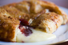 3. Spread jam on brie, fold dough over top, cutting off excess dough.