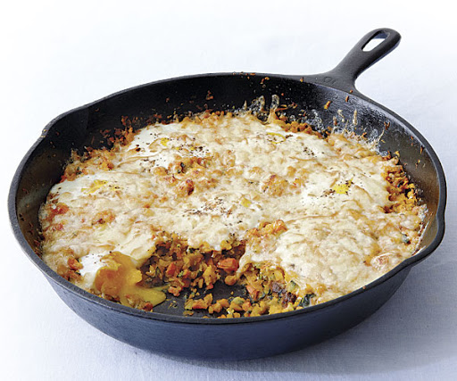 Shirred Eggs with Vegetable Hash and Smoked Cheddar