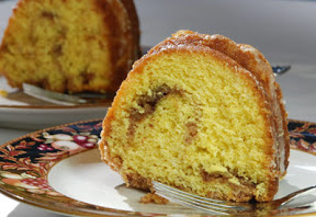 Bake for 40 to 50 minutes until a cake tester or long skewer inserted into the cake comes out clean. Place cake on a cooling rack and let cake cool upright in the pan for 20 minutes. Invert cake onto serving tray and drizzle with glaze.