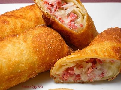 Reuben Egg Rolls are a fun twist on the classic sandwich. Corned beef, cabbage, Swiss cheese and Thousand Island wrapped in dough and fried.