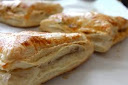 Heat olive oit in large skillet over medium-high heat. Add onion and garlic; stir 2 minutes. crumble ground beef into skillet. Brown beef, stirring to break up meat. Add oives, raisinsm etchup, parsley and cumin; cook and stir another 2 mins. Unflod puff pastry sheet on cutting board. Cut into quarters; the cut each quarter diagonally to form 8 triangles. Divid beef mixture evenly onto each triangle. Brush edges with water; fold each in half. Press edges together and seal with fork tines. Place triangles on a baking sheet lined with parchment paper. Brush beaten egg yolk over triangles. Bake 15-20 minutes. Serve while hot.