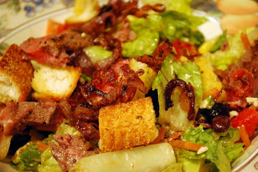 Here’s a simple salad that is great for the winter when ripe tomatoes are no where to be found. It’s also a great way to stretch a steak. You can use whatever steak is on sale or that you prefer. This time around we used Shell Steaks. Flank steak would be great, even London Broil sliced nice and thin. And of course, you can switch out the beef for chicken if you’re looking to cut the fat.