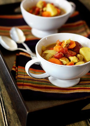 Pour the broth into the pan and stir, making sure to scrape up any browned bits on the bottom of the pan because they have a lot of flavor. Stir in the coconut milk and potatoes. Let simmer for 5 minutes. Then add the tomatoes and carrots. Simmer until vegetables reach desired tenderness. Season the stew with salt and pepper to taste, if desired.