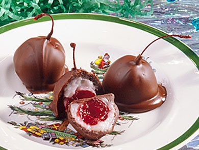 2. In small bowl, combine confectioners' sugar, butter, and milk; mix until stiff dough forms. Shape dough evenly around each cherry and place on baking sheet. Freeze 15 minutes, or until firm.