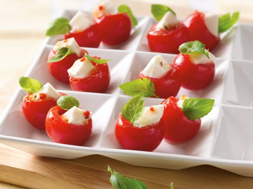 2 In small bowl, toss cheese and dressing. Place 1 cheese cube in each tomato; top each with basil leaf.