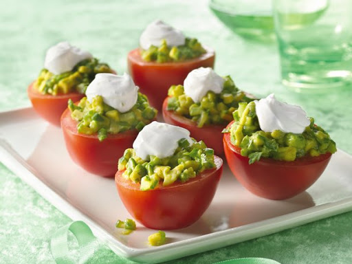2 In medium bowl, mix remaining tomato cup ingredients. In small bowl, mix topping ingredients. Spoon about 1 tablespoon avocado mixture into each tomato shell. Top each with about 1 teaspoon topping.
