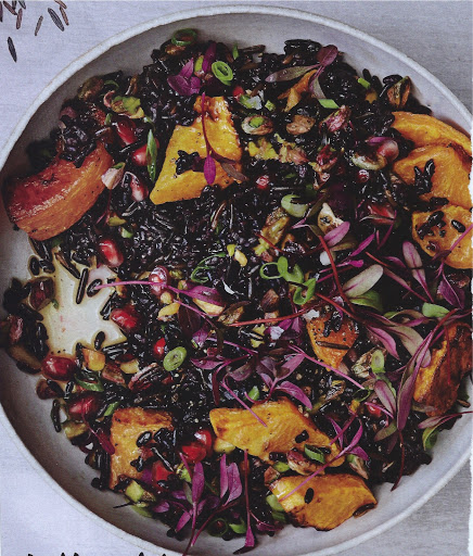 Whisk vinegar, honey, and remaining 1/4 cup oil in a large bowl. Add black rice and wild rice, squash, scallions, pomegranate seeds, micro greens, and pistachios; season with salt and pepper and toss to combine.