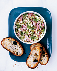 In a small saucepan, melt the anchovies in the olive oil over moderate heat, stirring. Scrape the anchovy oil into a medium bowl. Add the ham, cabbage, pickle and chopped dill, season with salt and pepper and mix well. Pack the ham mixture into a 3-cup ramekin and garnish with dill. Serve at room temperature with the bread and mustard.