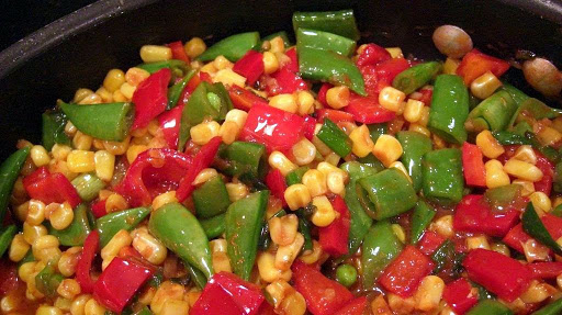 In a large skillet, heat 2 tablespoons oil over medium-high heat. Add the bell peppers and garlic and cook for a few minutes. Add the corn, snow peas , and scallions and cook for a few minutes more. Stir in 1/4 cup of the hoisin sauce and the 2 teaspoons hot sauce. Stir to combine and serve.