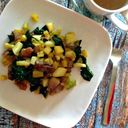 Add the chopped apple and zucchini. Continue cooking, stirring often, until sweet potatoes are fork tender. Finally, fold in the kale and cooked bacon/pancetta.