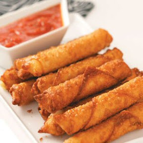 Place a piece of string cheese near the bottom corner of one egg roll wrapper (keep remaining wrappers covered with a damp paper towel until ready to use). Fold bottom corner over cheese. Roll up halfway; fold sides toward center over cheese. Moisten remaining corner with water; roll up tightly to seal. Repeat with remaining wrappers and cheese.