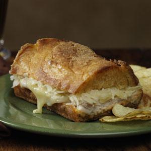 In a small bowl, combine the first five ingredients; spread over bread bottom. Layer with turkey, cheese and sauerkraut. Replace top. Cut into six slices.