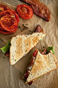 Apply basil mayo, generously to two slices of lightly toasted bread. Add crispy bacon, lettuce and cooled, roasted tomatoes.