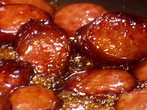 Cut sausage into 1” rounds. Place in large skillet over med-heat and add the maple syrup. Bring to a boil, and then reduce heat to low and simmer 20 minutes. Serve piping hot.