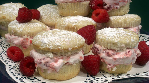Remove the muffin papers from the cupcakes and cut the tops off of each cupcake.Spoon the raspberry whipped cream atop the cupcake bottoms. Place the cupcake tops on the cupcakes. Dust with more powdered sugarand serve with the remaining berries.