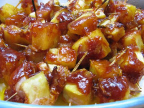 4.Wrap each pineapple chunk with a piece of bacon, securing with a wooden pick.