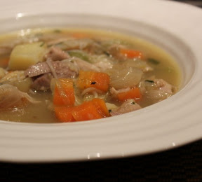 Desmenuce el pollo. Transferir el pollo desmenuzado a la sopa y se deja cocer por un minuto más antes de servir