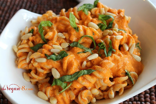 Garnish with fresh chopped basil and pine nuts. Serve over spiral pasta. I much prefer the spiral pasta over spaghetti noodles for this sauce because it gets in between the grooves and has a better texture.