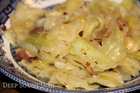 Southern fried cabbage is a very simple cabbage dish prepared often as here, with a bit of butter, bacon & onion. I like to add cider vinegar and dried pepper flakes for a little extra flavor punch.