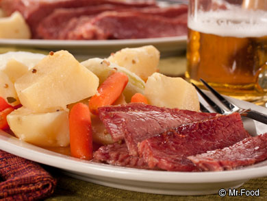 Place corned beef on a cutting board and slice across the grain. Serve with vegetables.