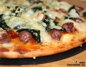 Finalmente cubre la pizza con los quesos emmental y mozzarella rallados. Hornea la pizza en el horno precalentado arriba y abajo o turbo, a 200º C. En unos 20 minutos o cuando la masa esté dorada y los quesos fundidos y dorados, retira la pizza de salchichas y espinacas del horno, espolvorea un poco de orégano seco y a comer.