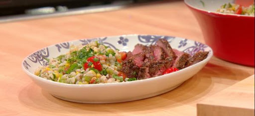 Umami-Marinated Flank Steak with Pearled Barley and Corn Salad