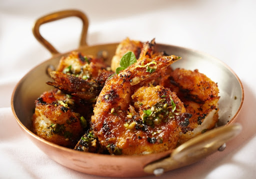 *In a bowl*, mix the crumbs, parsley or basil, garlic, cheese, Olive Oil, paprika and oregano. *Sprinkle* mixture over shrimp. *Bake* 10-12 minutes, divide between two plates and serve.
