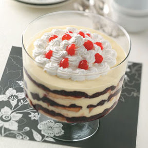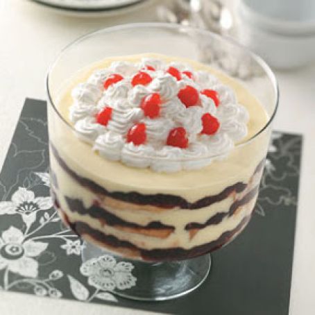 Fold sugar and vanilla into remaining whipped cream; spoon on top of trifle. Garnish with cherries.