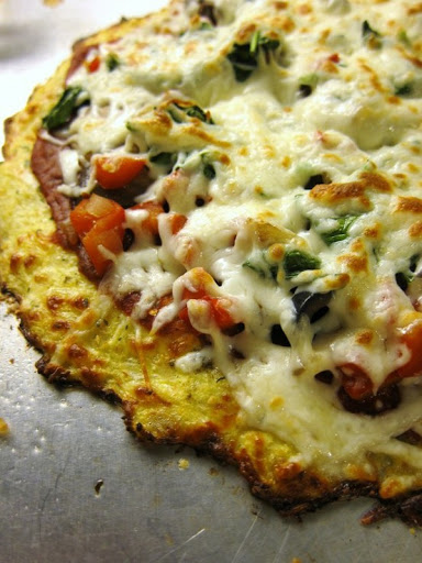 In a medium bowl, stir together 1 cup cauliflower, egg and mozzarella. Add oregano, crushed garlic and garlic salt, stir. Transfer to the cookie sheet, and using your hands, pat out into a 9" round. Optional: Brush olive oil over top of mixture to help with browning.