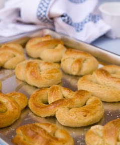 After dough has risen, pinch off bits of dough and roll into a long rope (about 1/2 inch or less thick) and shape. Dip pretzel in soda solution and place on greased baking sheet. Allow pretzels to rise again. Bake in oven at 450 for about 10 minutes or until golden. Brush with melted butter and enjoy!
