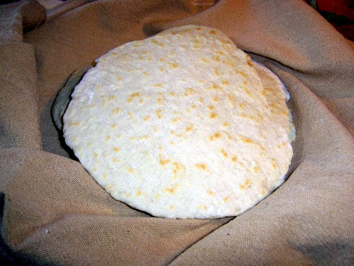 Sift dry ingredients together. With a pastry blender, cut in the shortening. Add about a cup of water until a medium dough forms. Knead for 5 minutes, and allow the dough to rest for 30 minutes covered. Divide into 12 portions. Shape each portion into a ball, and roll out until 1/8 inch thick. Bake on a hot griddle.